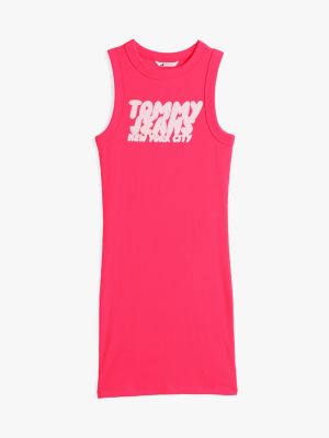 This slim-fitting bodycon mini dress combines a crew-neck tank top with a bold bubble logo for a striking look.
