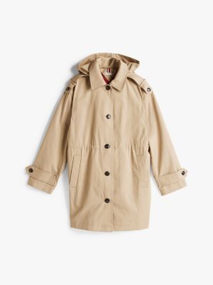 This water-repellent parka borrows its look from the trench coat, and features a hood plus a drawstring waist for practical style.