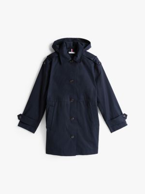 This water-repellent parka borrows its look from the trench coat, and features a hood plus a drawstring waist for practical style.
