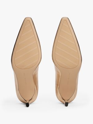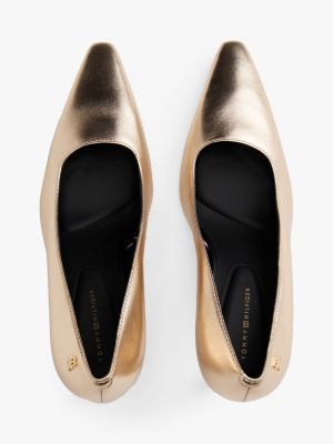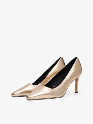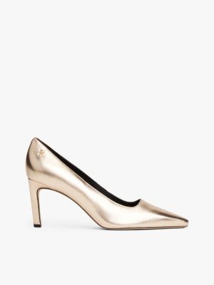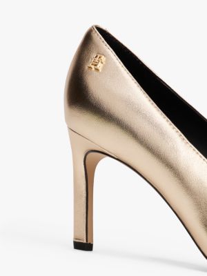 Add a festive touch to your evening ensembles with these metallic leather stilettos, featuring a modern slanted heel and TH monogram detail.