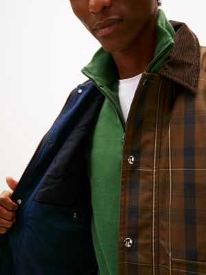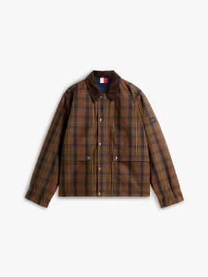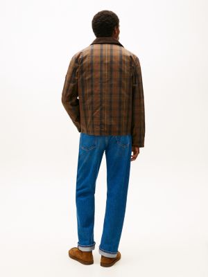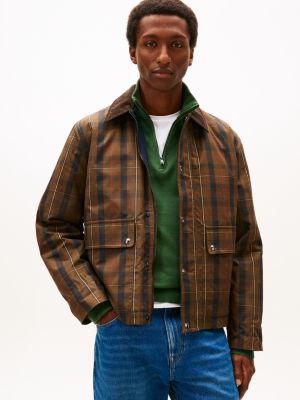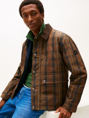 This barn jacket is a modern take on classic waxed styles, featuring an all-over tartan check and a contrast corduroy collar.