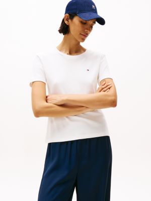 Find your perfect fit with our range of Tommy Hilfiger t-shirts for women. Our selection of t-shirts are crafted in pure cotton and lightweight jersey to keep you cool and comfortable, while fresh cuts and colours embrace our signature East Coast cool. Our versatile collection of women's long sleeve t-shirts can be dressed up with a pair of high heel boots or dressed down with a pair of comfortable chunky trainers, allowing you to curate an outfit suited to your mood. Whether you are looking for a timeless women's white t-shirt to match a pair of inky denim jeans, a varsity t-shirt to wear with easy-going sweatpants, or a relaxed women's oversized t-shirt with a tailored-meets-casual pair of slim-fit trousers and city trainers to match, there’s a women's Tommy Hilfiger t-shirt to complete your wardrobe. Make a statement in our printed t-shirts and slogan t-shirts or embrace classic colours for an everyday laid-back look. With this season’s latest designs of t-shirts for women covered, finding your perfect match has never been so seamless.